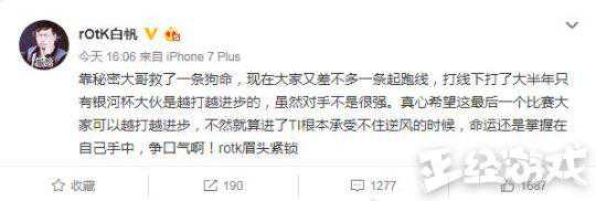 在秘密的赛后,VG队员rOtk发了一条微博称被秘密救了一条“狗命”,接下来只希望自己可以越打越进步,争口气!