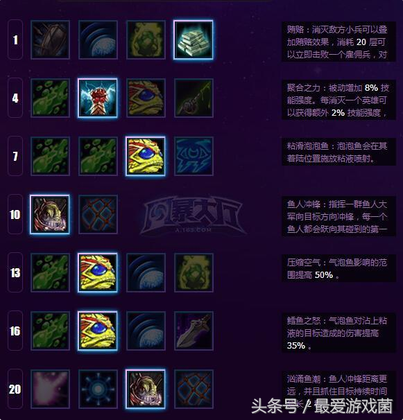 主要就是鱼人冲锋和泡泡鱼,主要的就是偷塔准备,泡泡鱼的清线能力是无可匹敌的,Q和E的骚扰起到一个明显的恶心对方的作用,后期的伤害是非常之高的,只是鱼人冲锋不能对小兵起作用,当然也有其他技能的点法。