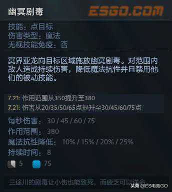 以上为近几个版本毒龙的改动数据,其中7.07版本重做了一技能“毒性攻击”:与原二技能合并。并重做了二技能“幽冥剧毒”:使目标区域内敌方单位受到持续魔法伤害,降低魔抗以及禁用被动(类似大隐刀的效果)。这使得例如钢背兽、哈斯卡、幻影刺客等被动技能被破坏会造成英雄实力大幅度削弱的英雄非常惧怕毒龙。
