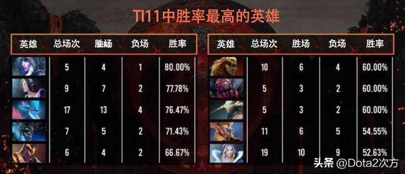 今日,官方给出了TI11正赛阶段到目前的英雄数据。