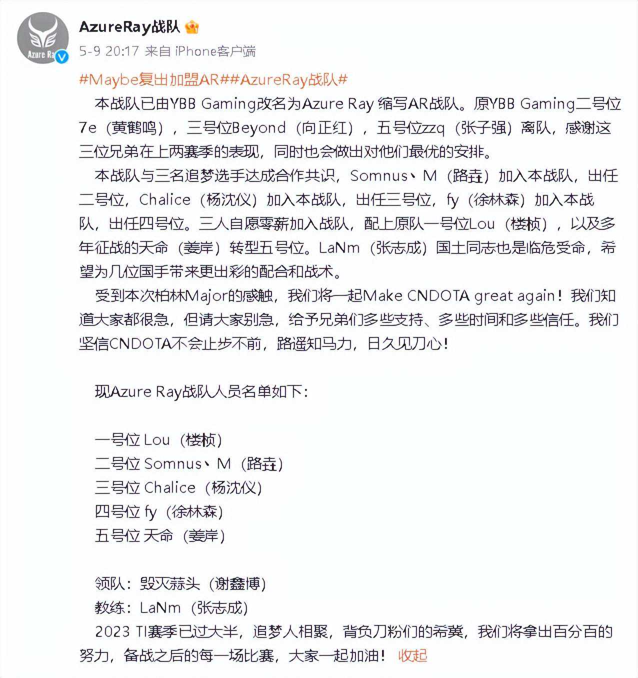 而原XG教练LaNm国士无双离队,加入AR战队,这支队伍由XG二队YBBGaming改名为AzureRay缩写AR战队,队员分别为Lou、Somnus丶M、Chalice、fy、天命。