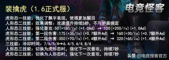 新赛季裴擒虎的改动很多,简而言之就是人形态的消耗能力加强,虎形态的收割能力减弱,三技能的CD时间变短。
