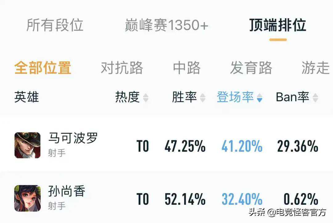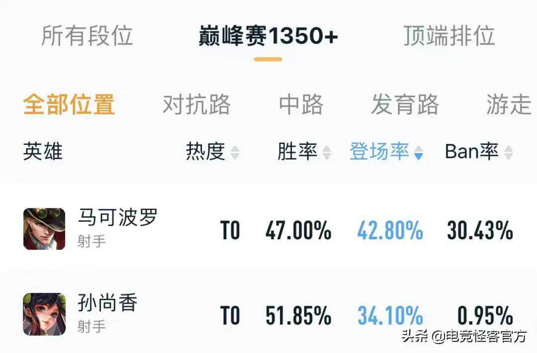 不管是在巅峰赛1350分以上,还是在顶端排位,马可的出场率都是第一名。