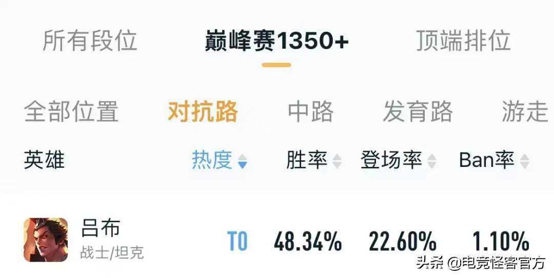 目前吕布无论是在所有段位还是在巅峰赛1350都是最热门的对抗路,虽然为了限制黄刀的契合度,减去了二技能的伤害。但是综合来讲,吕布还是对抗路无可替代的存在。