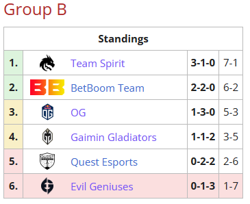 而在B组中,TSpirit以3-1-0几乎完美的战绩位列B组头名。另外,EG以0-1-3的战绩已确定淘汰出局。