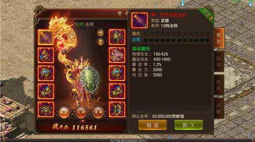 基础属性:物理攻击150-525;魔法攻击430-1900;暴击率1.2%;暴击力3300;内功值2583