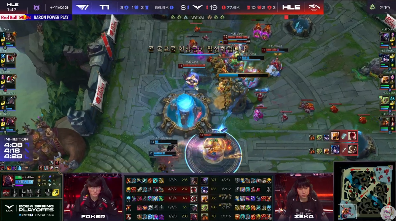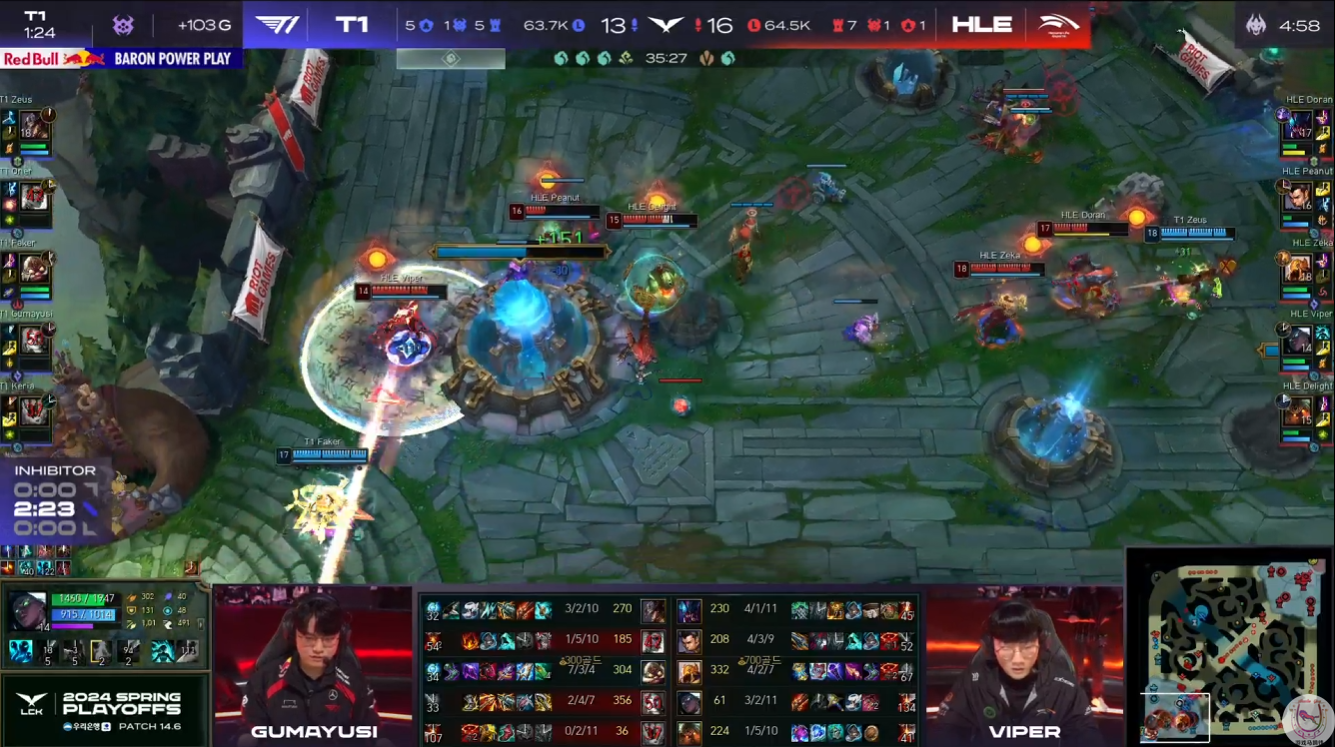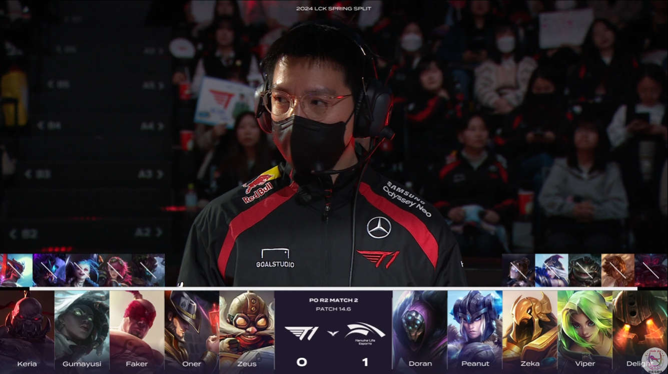 LCK季后赛,T1对战HLE。因为GenG主动选择了DK,所以由常规赛双方打成1-1的两支队伍在另一半区交手。只不过最近的版本泽丽很强势,而T1这套已经打了3年的阵容,哪怕是夺冠了全球总决赛,时至今日依然无法掌握这个英雄。今天对战HLE,也是被Viper打出了一把超神泽丽!