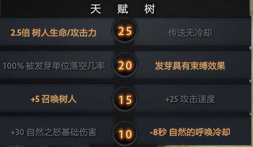 在加点上选择主自然的呼唤,副加传送,在2级或者4级学习发芽,有大点大,之后在天赋方面选择-8秒自然的呼唤冷却,+5召唤树人,发芽具有束缚效果,2.5倍树人生命/攻击力。