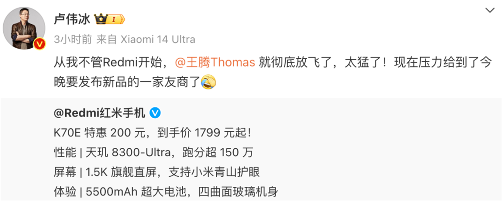 发布会定在同一天也就算了,Redmi还在一加发布会的前几个小时,宣布RedmiK70E直降200,1799起到手。