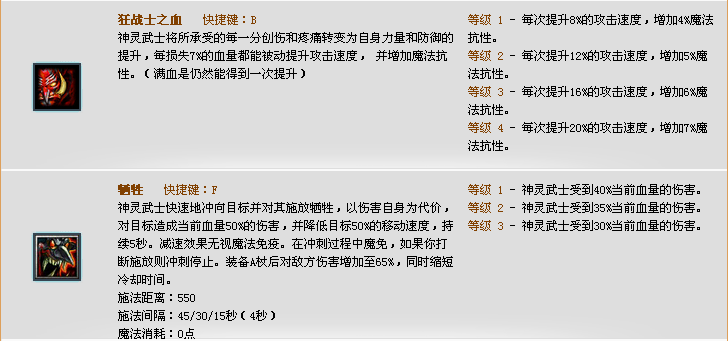 神灵武士在6.78版本被改动后迅速成为玩家们的最爱,有的人甚至说他已经无敌,我们先看下他在6.78的改动:基础力量增加3,沸血之矛的每秒伤害从4/8/12/16增加到5/10/15/20,牺牲的生命值消耗从35/30/25%提高到40/35/30%、狂战士之血由原来的每损失7%血量将被动提升攻击速度和攻击力改为提升攻击速度和魔法抗性。由加攻击改为加魔抗使他迅速大热,甚至被称为法师克星。相信大家应该都玩过神灵武士以及和他对过线,大家有没有用或者被沸血之矛点的爽歪歪的,在加上沸血之矛点英雄不拉小兵仇恨的特性使得他在对线大多数英雄时都是碾压(进攻击距离就点你没商量)。