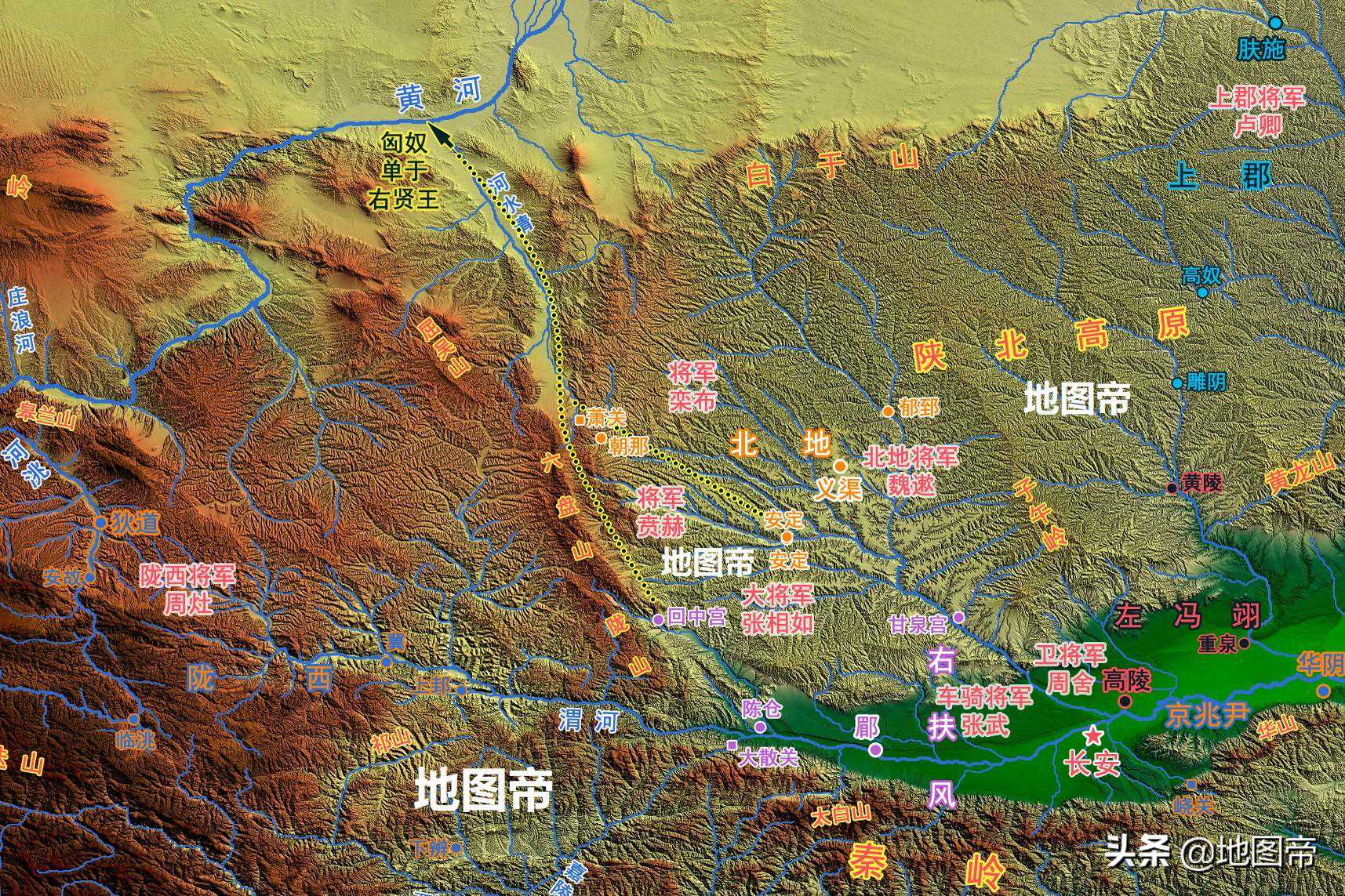 汉初北地郡与秦朝一样,太守府设在义渠,西北部清水河上游建有萧关,背后还有一座城邑朝那。北地郡的都尉,管辖范围就是萧关和朝那。