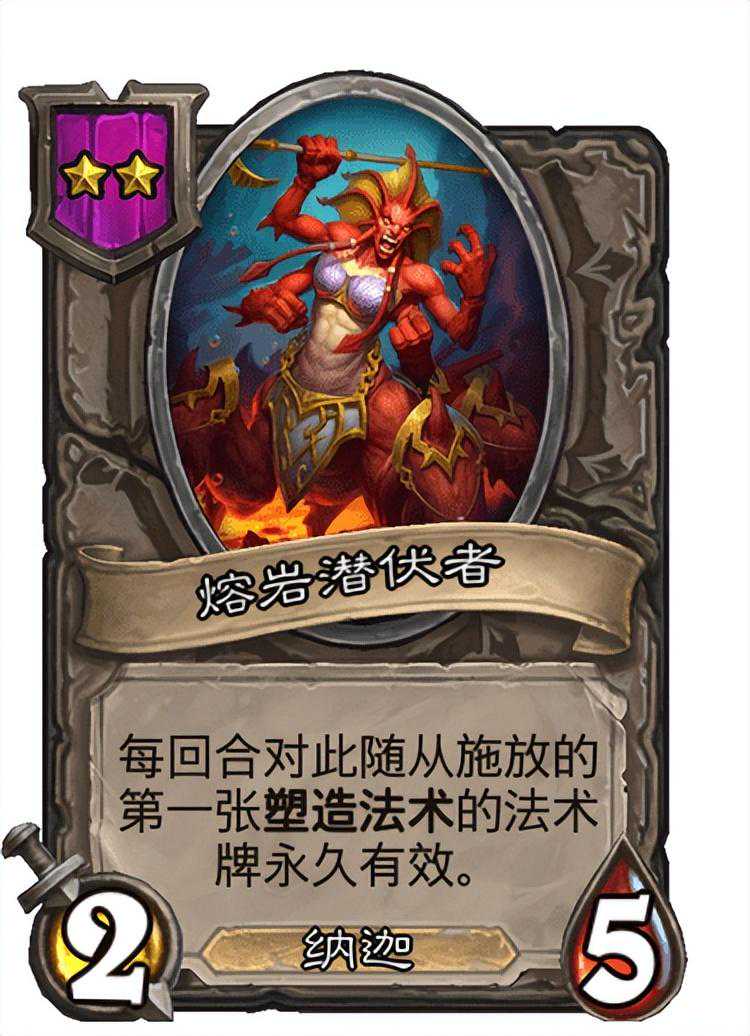 熔岩潜伏者作为前中期打工卡非常厉害,第一张永久有效,前期低费的纳迦以及法术效果傍身后,可以达到连胜保血的效果。前期两个低费纳迦效果契合,就算是一个低攻后血的小墙,也够顶了。抓到后可以适当跳本,血量也不会掉太多。