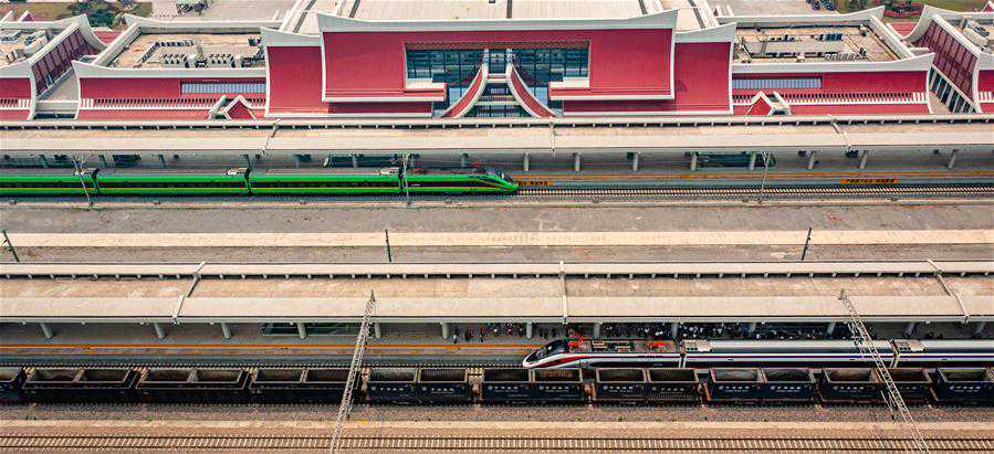 4月13日,“复兴号”(上)、“澜沧号”动车组列车停靠在中老铁路磨憨站(无人机照片)。新华社记者胡超摄