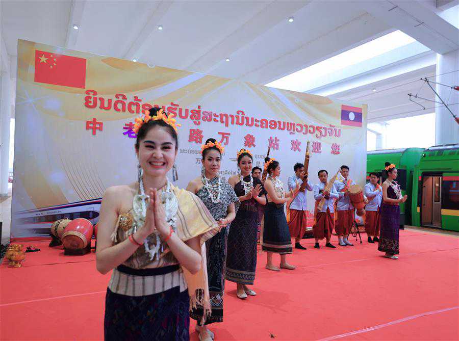 4月13日,在老挝万象站,工作人员欢迎乘坐D887次国际旅客列车的旅客。新华社记者邢广利摄