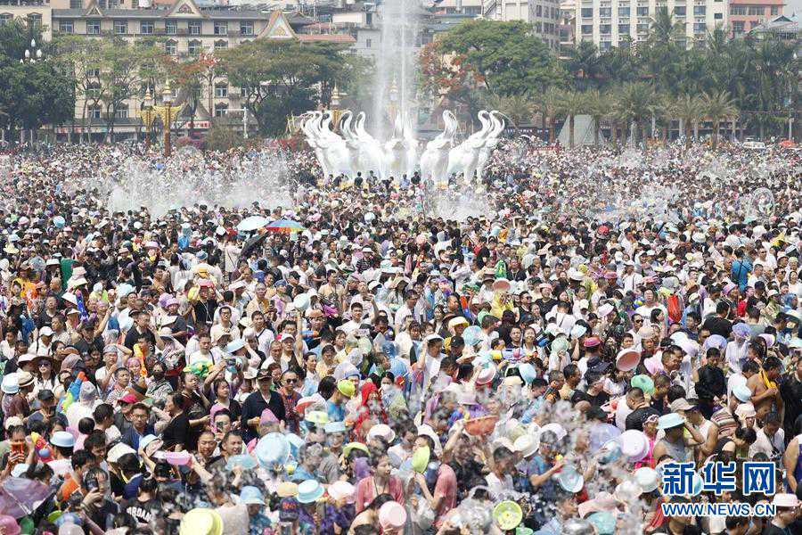 4月15日,西双版纳州景洪市泼水广场,上万人参加泼水狂欢。新华网徐华陵摄