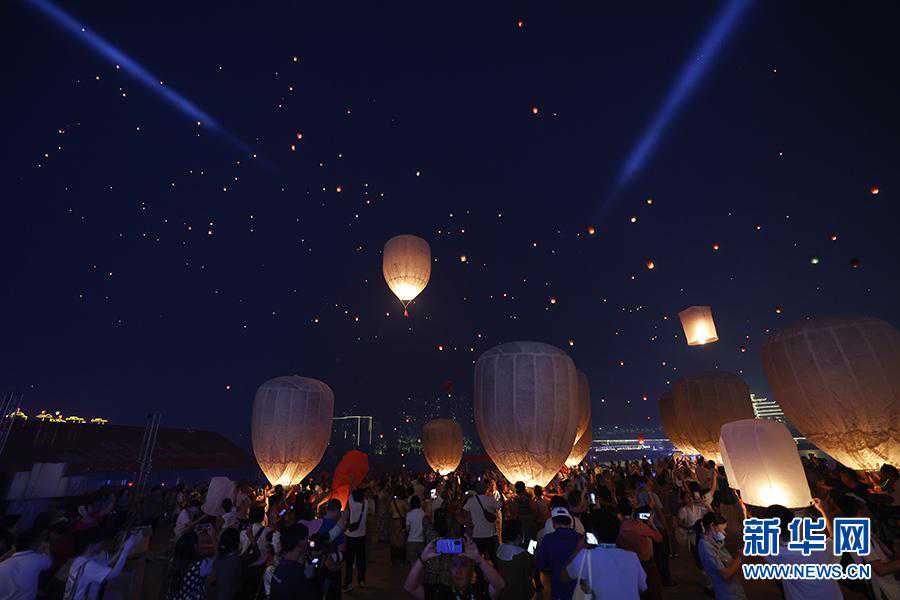 4月13日,西双版纳州景洪市澜沧江畔,市民和游客放飞孔明灯。新华网徐华陵摄