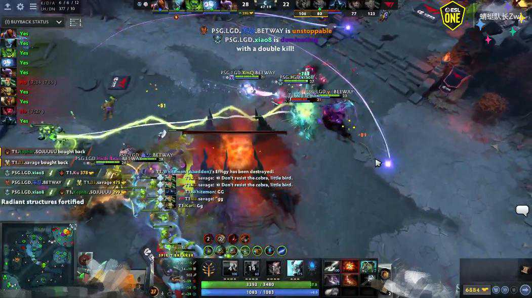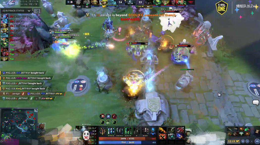 而T1似乎也是一支会玩电狗的战队,T1四人组在美杜莎的弱势期也是抱得非常的紧,再加上树精卫士对于防御塔的保护能力,几乎没能找到T1的破绽。而当美杜莎成型后,T1也是通过好几次完美的蹲人反打牢牢地掌控住了局势,陷入了“慢性死亡”的节奏……
