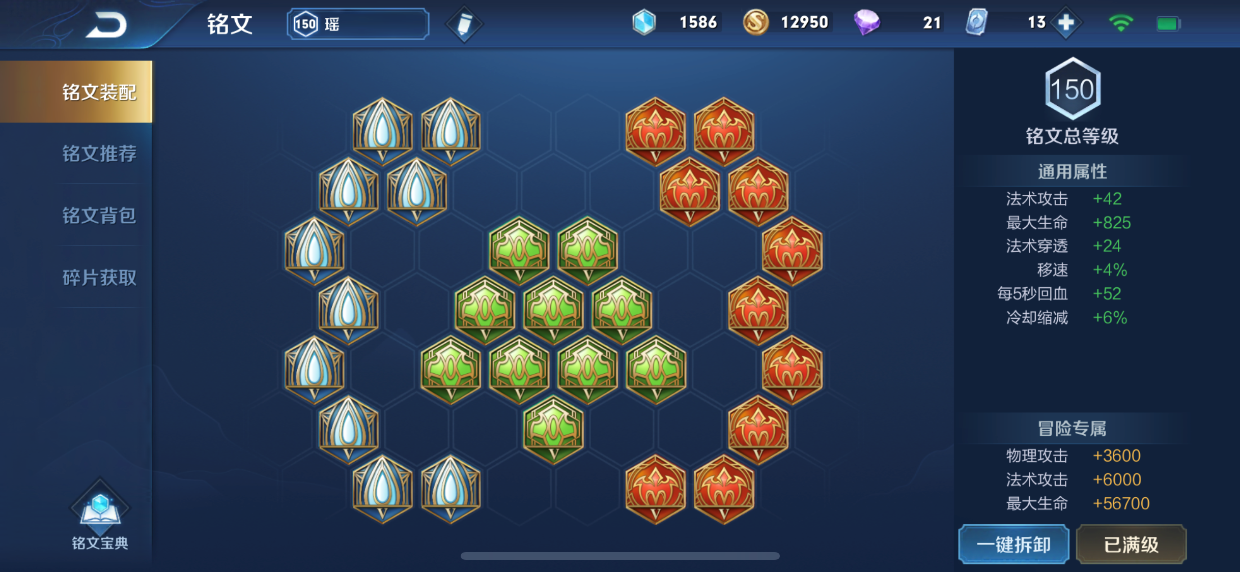 瑶的大招受到自身最大血量的影响所以她比较需要血量,蓝色和绿色我们选择增加血量的调和和虚空。瑶另外一个非常重要的属性是CD,大招满CD跳下来的情况只有4.5的CD,所以我们非常需要10个虚空提供的6%CD。最后瑶最为一个法师英雄,需要一定的法强和法穿弥补前期伤害不足的缺点,所以红色选择提供法强和法穿的梦魇。