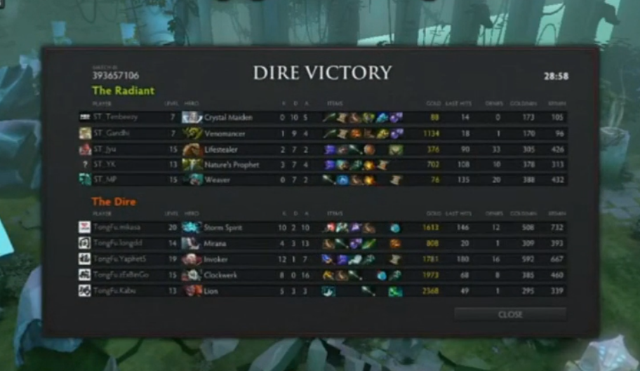 第二局:各种单杀全面碾压,下路单杀对面先知,中路击杀对面小狗剧毒冰女,上路单杀对面蚂蚁,29分钟结束比赛(9-40),对面直接:ggy-god(吹P神)。打出这行字的是ST_MP,他是当时的韩国第一solo。(记得当时YYF他们还直播了这场比赛,然后第二盘的时候ldd在steam上发信息让胖头鱼他们赶紧吹吹自己的白虎,然后那天各种吹视野箭,封路箭,逼走位箭,人头箭各种吹)