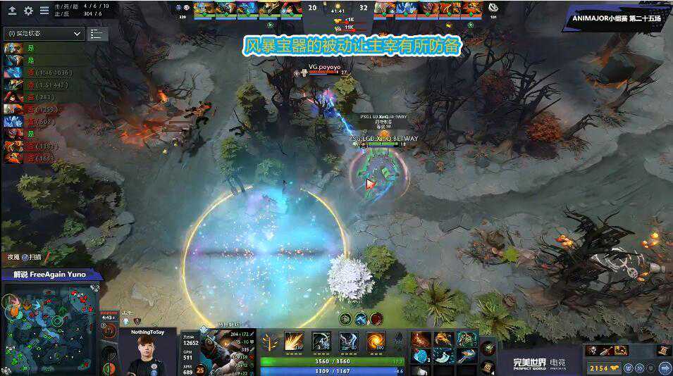 转折点就在与XinQ的小强开大Gank时,中立道具风暴宝器的被动(每3秒电击700范围内一个敌人,造成200点伤害并减速40%,持续0·3秒)让poyoyo的主宰有所察觉,导致Gank失败;随后的VG果断地开雾反扑,凭借老十一完美的先手(秒掉无法买活的术士)成功翻盘。