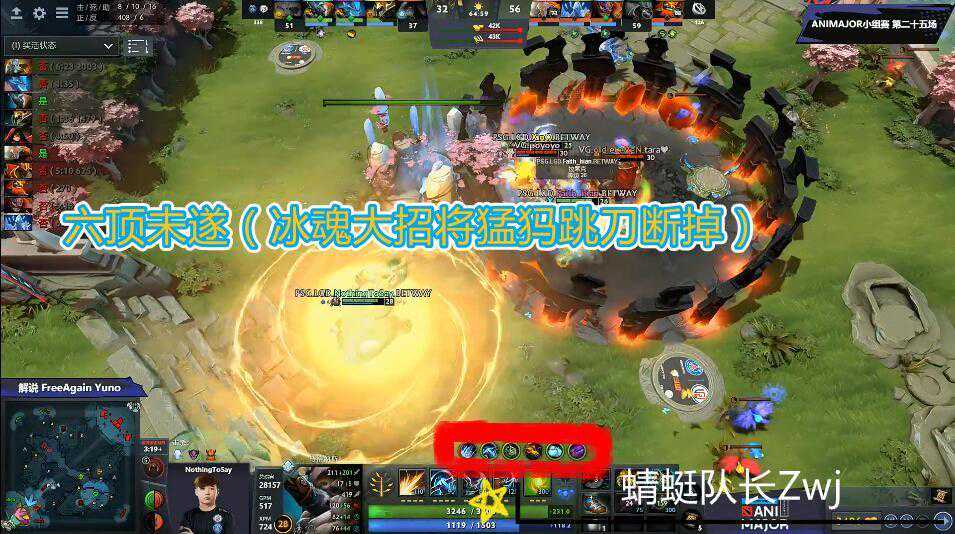 第六部:准备刷新再跳大接顶的莫言忽略了冰魂大招的效果(原地空大),见此情况直接敲出GG,VG艰难取得一分。
