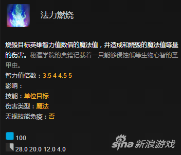二技能:法力燃烧。顾名思义,燃烧魔法值且造成等量的伤害,这个技能既可以对高智力脆皮英雄进行相当可观的魔法输出,也能对缺少蓝量的力量敏捷英雄造成团战的缺蓝无法释放技能,这个技能在下建议前期如果队友能够提供足够控制且对面法师居多的情况下可以主加,满级4秒的冷却时间足以让智力英雄闻风丧胆。