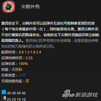 尖刺外壳,俗称小强的皮,这个技能使得小强有了在团战中足够的生存和发挥空间,满级十秒的冷却和长达2.4秒的控制时间让身为敏捷脆皮英雄的小强在面对一些高爆发英雄时也毫不畏惧,比如在对方有火女这种英雄的时候,可能正当他高兴的准备收下你的人头的时候,开出你的皮,也许化成骨灰的就是他自己了。