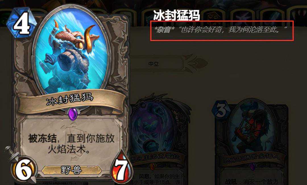 其次,暴雪设计师在这张卡牌描述中,夹带了一些“私货”文字:“也许你会好奇,我为何沦落至此”。这里就需要提前给大家科普一下《魔兽世界》与《炉石传说》共同的世界观设定,在艾泽拉斯大陆上是存在着猛犸这个种族,且不惧严寒的。换言之,这张不寻常的卡牌与卡牌描述,就是在公然调侃隔壁DOTA2家Ti10联赛,猛犸不被Ban的黑幕,连玩炉石的设计师都知道要永Ban猛犸。
