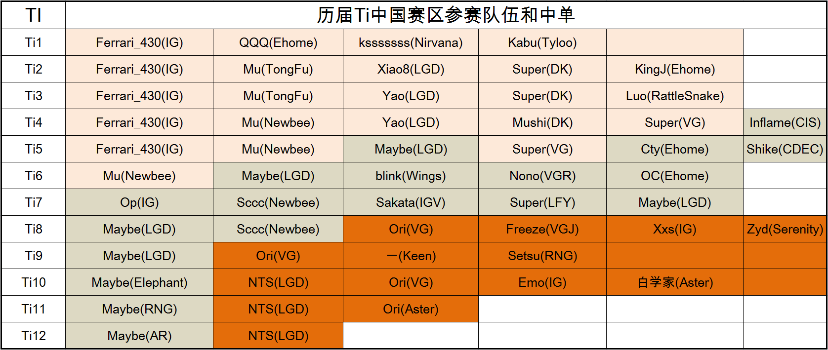 Ti目前举办了12届,除了Ti11和Ti12以外中国赛区每年队伍的数量都保持在平均5支,在12届ti里以ti5为界限可以分为开荒型中单,中军中单和新生代中单。开荒型中单以430,Mu和Super为代表,成绩非常耀眼,拿了2个冠军一个亚军;中军中单代表就是Blink,Maybe和Shike(两仪落),成绩也非常好,收获了一冠2个亚军,新生代中单代表是NTS,Ori和Emo,成绩一般,只有一个亚军。