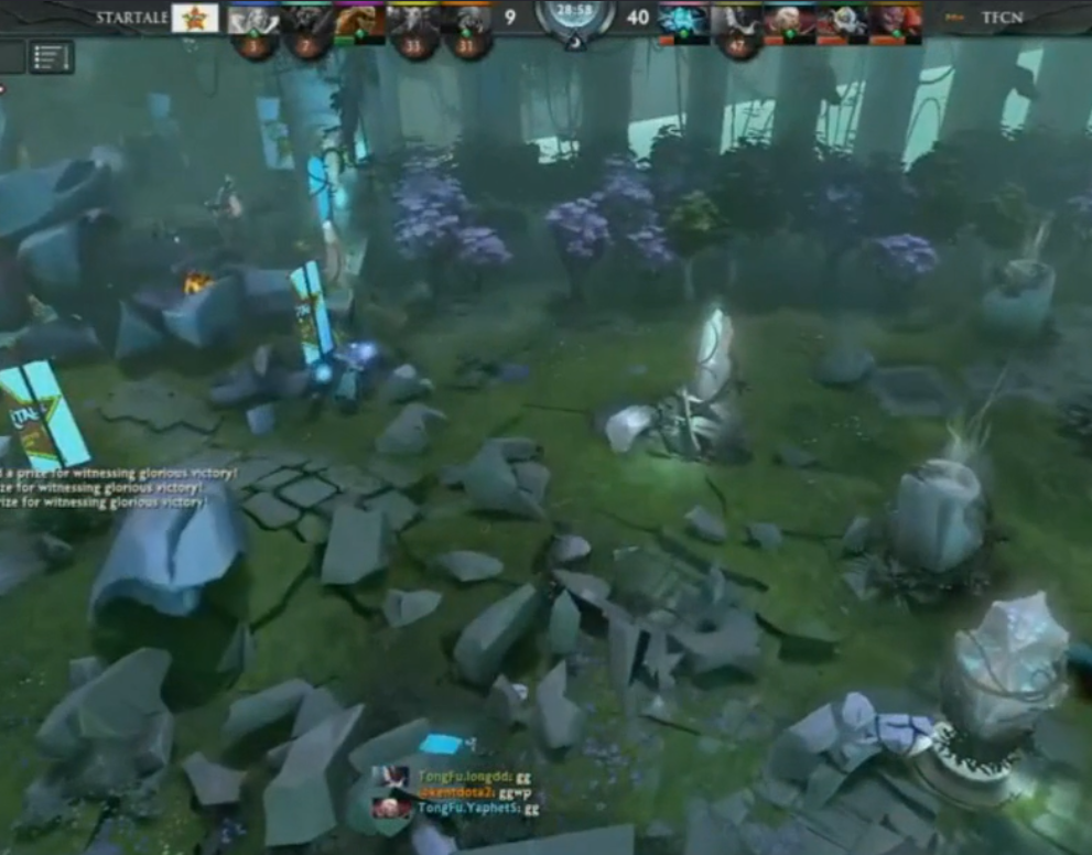第二局:各种单杀全面碾压,下路单杀对面先知,中路击杀对面小狗剧毒冰女,上路单杀对面蚂蚁,29分钟结束比赛(9-40),对面直接:ggy-god(吹P神)。打出这行字的是ST_MP,他是当时的韩国第一solo。(记得当时YYF他们还直播了这场比赛,然后第二盘的时候ldd在steam上发信息让胖头鱼他们赶紧吹吹自己的白虎,然后那天各种吹视野箭,封路箭,逼走位箭,人头箭各种吹)