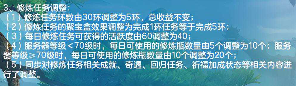 修炼任务调整算是本周更新的重中之重。跑修从最开始的100环减负到50环后来又减负到30环,这周更新更是将修炼任务从30环减负到5环。