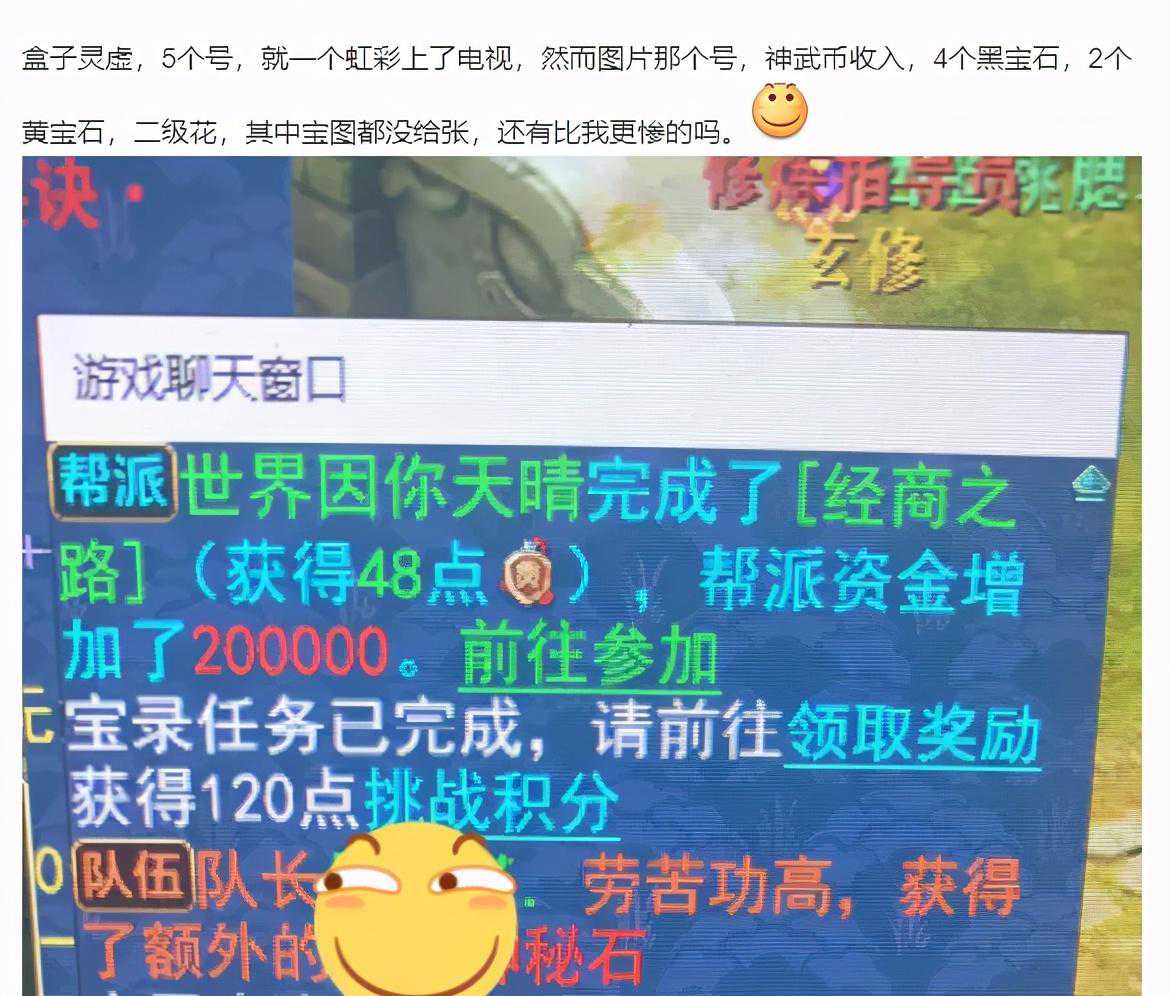 为什么这么说,因为跑修出丹的概率绝对跟环数成正比,环数越多出丹的机会越高。现在策划嘴上说修炼任务由30环调整成5环总收益不变但是之后肯定会暗改出丹率,他只要一改那玩家的神武币收益肯定就降低了,我挂脚本、开盒子多赚点神武币他不香吗,反正也耽误不了几分钟!