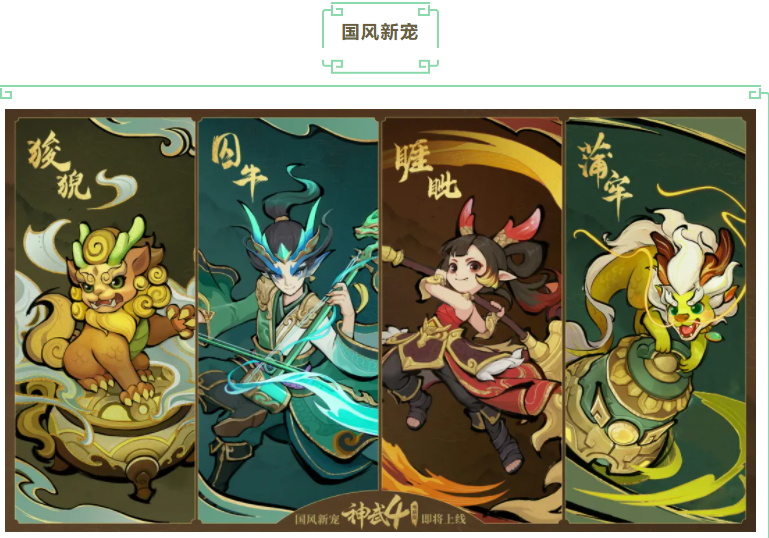 老大囚牛,平生爱好音乐,它常常蹲在琴头上欣赏弹拨弦拉的音乐,因此琴头上便刻上它的形象。喜欢弹琴这么文雅你给他整个刀剑上去砍砍杀杀那肯定不像样,所以囚牛90%概率是带琴类相关特殊的单法宠,比如牛头琴之音?