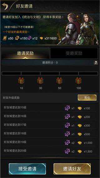 按要求分享可获得丰厚奖励,邀请你的好友可以一同帮助、成长以及抵御其他联盟的攻击、或者相反、你可以与你的好友一起掠夺其他联盟的资源。