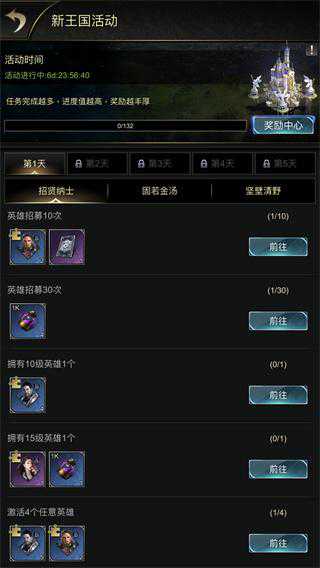 《统治与文明》新王国活动每天会开放新的任务页,完成对应的任务,可获得非常丰厚的任务奖励;在活动持续7天中根据你完成任务的多少,可以领取期限至永久的城堡外观。活动结束时有一个特别的宝箱奖励,奖励档位的划分是根据玩家完成任务数量的情况来划分。最高档的奖励包括2万金币,50小时的加速以及大量资源和英雄培养道具等道具,可以很好地帮助前期的发展,领先他人一步。新王国活动完成任务数达到130项,还可直接获得永久城堡外观——云端城。