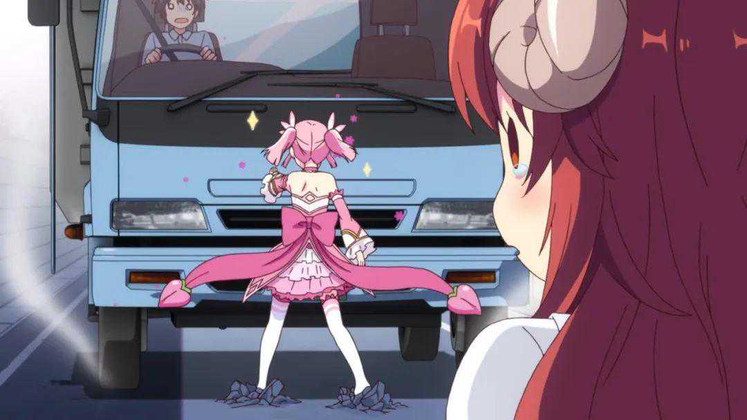 万分紧急的时刻,光之一族的魔法少女千代田桃及时赶到,一手挡住卡车救下了她!