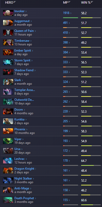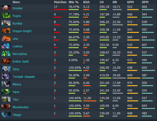 2他的英雄池不能说窄,但绝对不深。在他万盘dota数据下,他操刀过很多的英雄,他可以上手大部分的英雄。但同样的,数据是骗不人的,他的胜率实在是太平庸了。