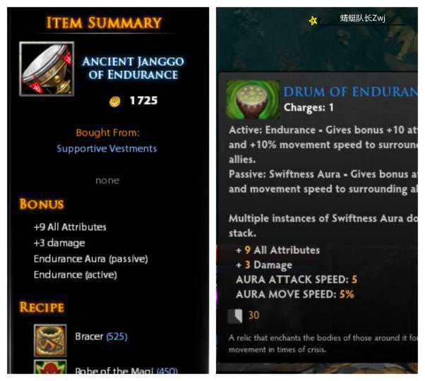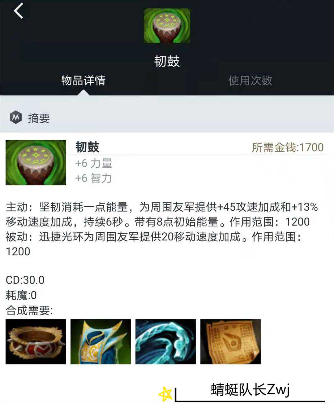 Tip:1700块钱的中件,却仅仅提供6点智力与力量和光环效果(主动+被动),简直是抠门到了极点(性价比极低),无论是在路人局还是比赛中,这件装备的出场率都低得可怕。关于战鼓这件道具,我在另外一篇文章中就提到过了,但是因为我对这件道具有点特殊的情感,所以我这次又将这件道具提了出来。