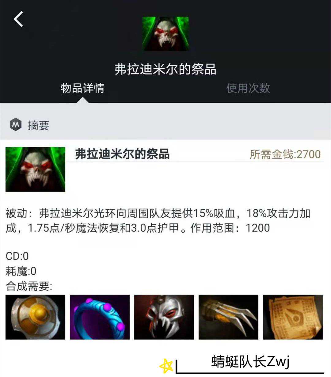 曾几何时,队内的Carry位选手总会喊道:“搞个祭品辅助一下我。”但是在撒旦、疯脸甚至是附魂面具、骑士剑(中立道具)等装备的包围下,其提供的吸血光环早已变得无足轻重了。总的来说,18%的攻击力加成、15%吸血、1.75点/秒魔法恢复、3点护甲的光环效果其实是不错的,但是其高昂的价格(2700)直接被性价比更高的梅肯斯姆(1875)、圣洁挂坠(2400)给爆中爆了。