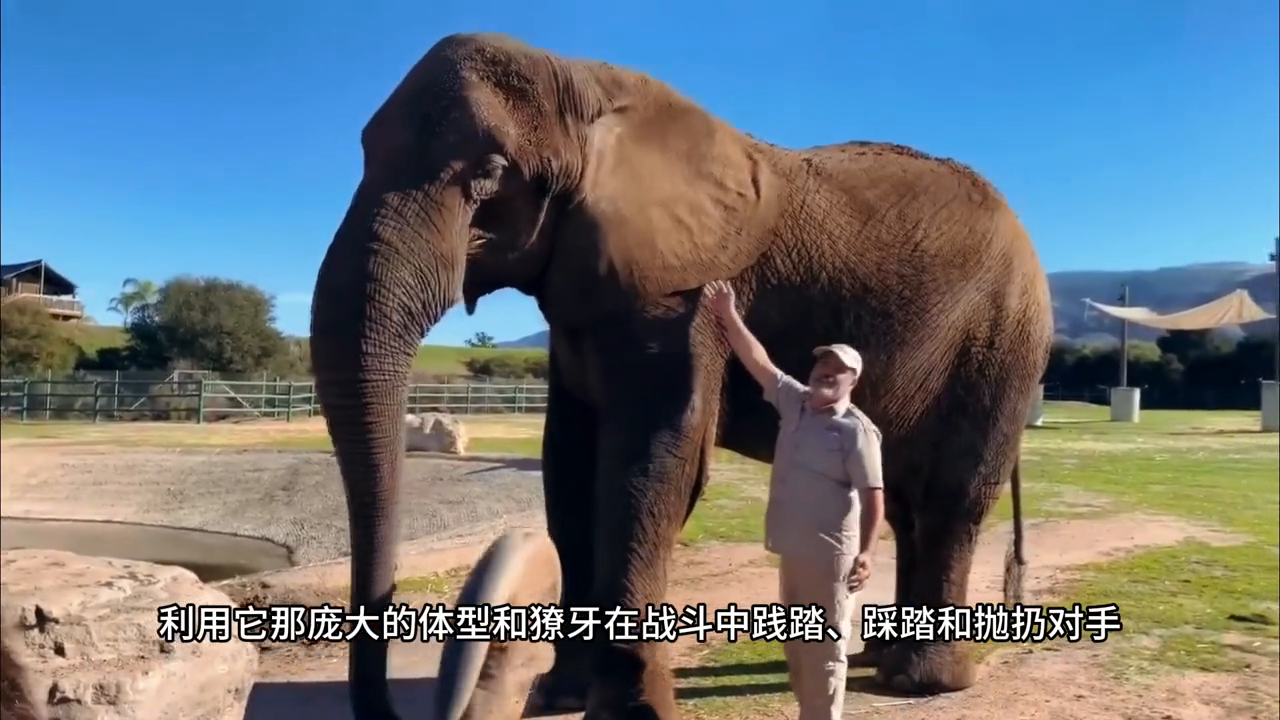 它是食草动物之王--非洲象,人们经常低估非洲象的杀伤力,但不要被它的素食主义饮食欺骗。大象是危险的生物,每年大约杀死500人,站立4米高,重达6.3吨的非洲象,利用它那庞大的体型和獠牙在战斗中践踏、踩踏和抛扔对手。