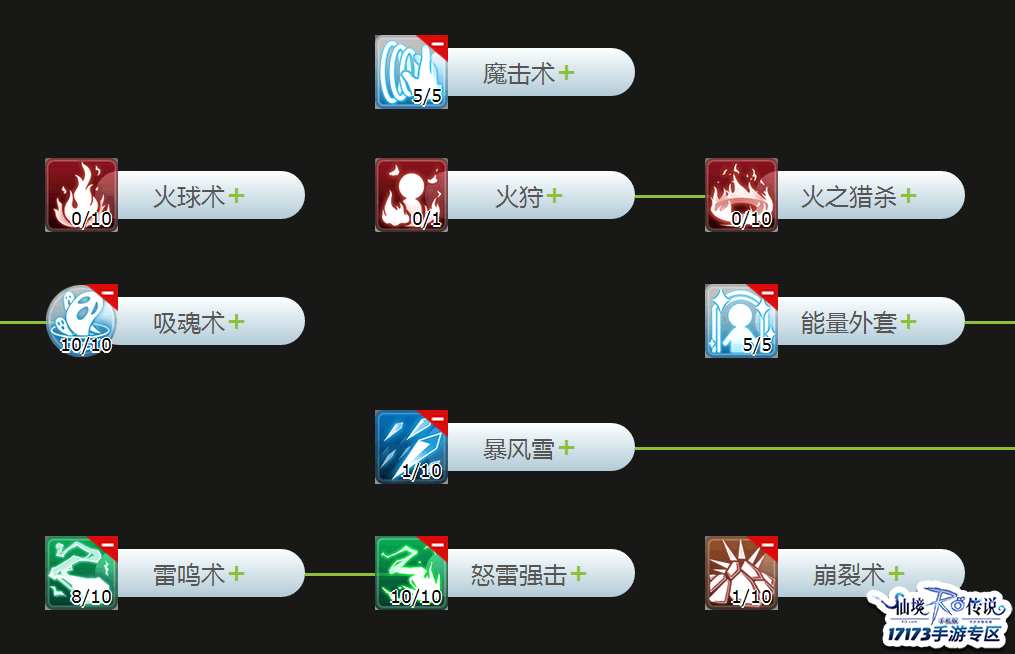 一转技能争议比较小,可以确定为10火箭、10火圈、10冰箭、10禅心。唯一有点争议的地方有两个:一是有的同学说单攻技能前期等级低装备不好的情况下吟唱太久,不要加满,几个单攻技能分别加5-7级后期再洗点;二是有同学走冰雷路线加满冰冻术。