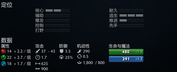 初始数据先看英雄初始数据,出门白字攻击力37-43,这个攻击力要比传统的核心位置英雄低了很多,而且3.5的护甲和480的出门血量都表明他是一个不折不扣的脆皮英雄,要说出门数据上唯一能吹的就是625的攻击距离了,这个攻击距离还是可以让小骷髅在对线期有一个比较安全的位置补刀。
