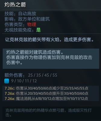 二技能灼热之箭,小骷髅的技能几个大版本都一直在改,只有灼热之箭没什么太多的变化,可见灼热之箭对于小骷髅这个英雄有多么重要。灼热之箭的发球效果可以额外的提供伤害,使得出门攻击力弹道又异常恶心的小骷髅在对线期有了不俗的耗血能力,没事用灼热之箭点对面酱油两下是真的蛮疼的,而且灼热之箭的额外伤害对塔也有效,使得小骷髅成为中期的拆塔小能手。