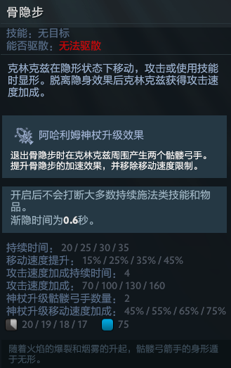 三技能骨隐步,为小骷髅机动性和爆发的关键技能。在新版本中在脱离骨隐步后还外会给小骷髅带来攻速加成,这也就成为了前中期小骷髅打爆发的核心技能。新版本的小骷髅A杖效果是加在了骨隐步身上,可以额外获得移速加成和产生2个微型大招,但是打核心的话A杖小骷髅太鸡肋了,所以这里也就不介绍A杖的具体用法了。