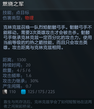 最后是大招燃烧之军,简称仪仗队。召唤一排的骷髅弓箭手,骷髅弓箭手可以继承小骷髅30%的攻击力同时也可以继承灼热之箭的发球效果(25级小骷髅如果学习灼热之箭齐发,那么燃烧之军也会获得灼热之箭齐发的效果)。