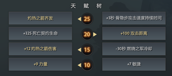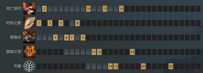 15级没什么说的,基本都是左边加12火箭伤害。20级的话,如果有蓝猫幽鬼这样每波团战盯着你切的英雄可以学一下左边+325死亡契约生命。25级灼热之箭齐发可以让小骷髅在带线或者是团战的DPS提升一个档次。