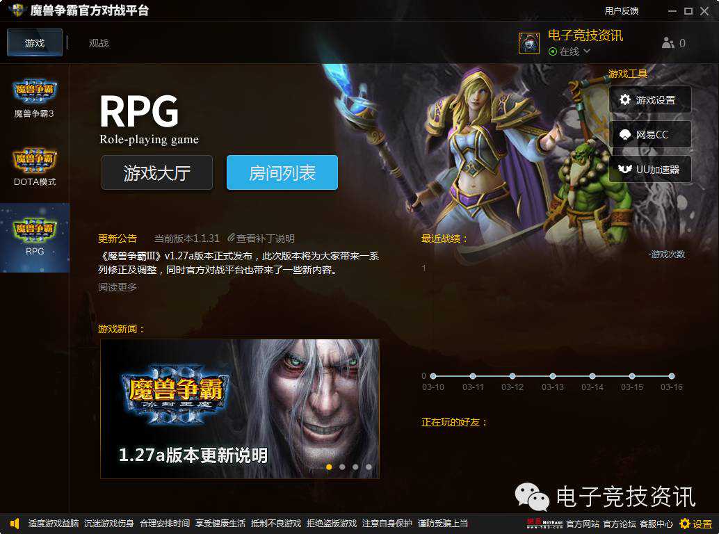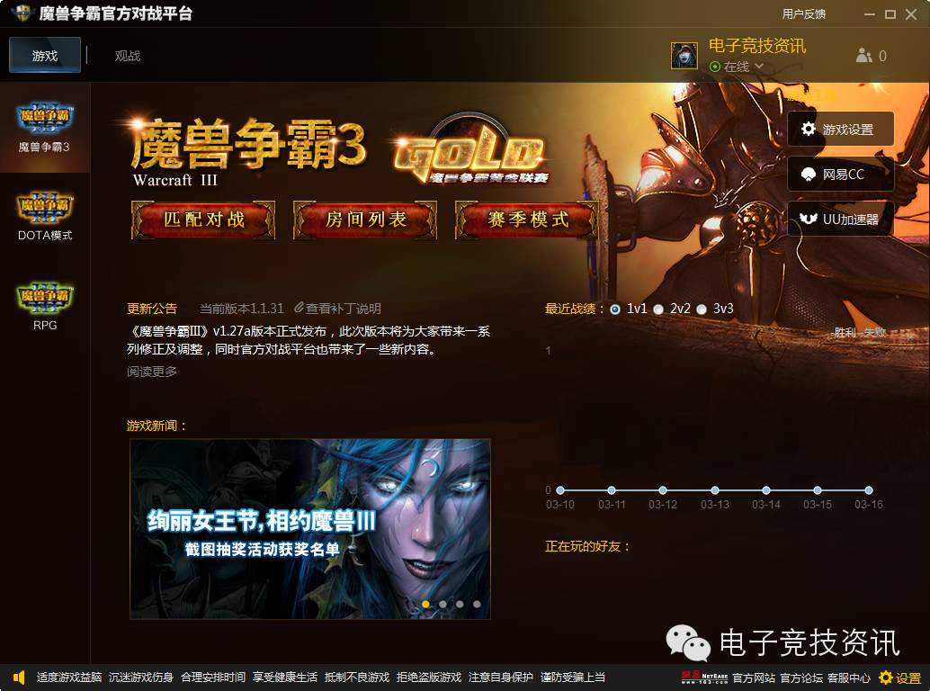 2016年3月15日暴雪正式发布魔兽争霸3的新补丁1.27版本!只需要通过魔兽争霸官方对战平台进入游戏即可体验《魔兽争霸Ⅲ》最新版补丁。那么官方对战平台有什么新特性呢?还没下载的朋友我们来抢先预览吧。打开官方网