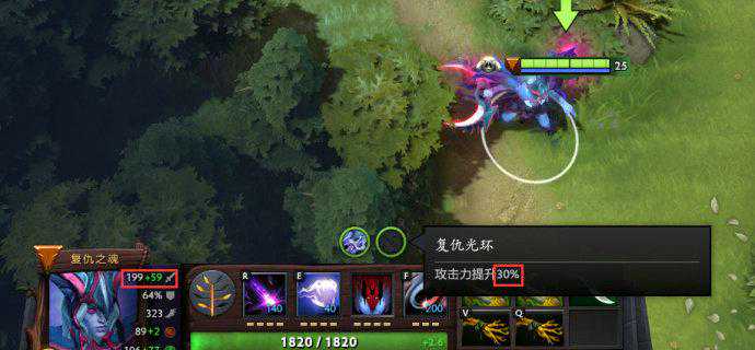如上图,复仇之魂攻击力199点,光环提供59点绿字攻击力加成,符合实际情况;然而,被击杀原地复活后几秒钟内,光环的buff图标变为缺省的默认图标,而绿字攻击力加成也随之消失。