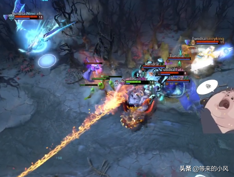 18分40秒,Nine有一次非常细的操作。当时Tundra众人正在围追堵截Ceb的伐木机,但Nine并没有A上去!这不是失误,而是一个精密的计划:当时Ceb有清莲宝珠,可以拿来解掉巫师之刃和严寒烧灼持续伤害的debuff。而Nine耐心地等到队友光法先给他上了炎阳之缚,Ceb用莲花球解掉了这个debuff后,冰龙才开始平A。