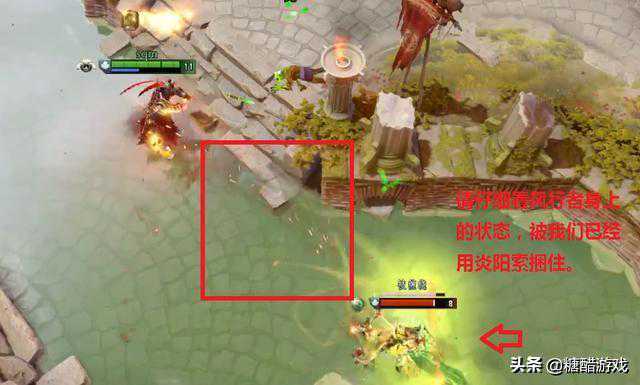 为什么能够达到离对手这么远捆住对手的效果?正如我之前介绍中说到过的,利用无影拳做位移,在飞到空中的瞬间按下炎阳索,就能起到这种远距离控制人的效果,当然最好是附近没有其它敌方的单位,这样的成功几率会更高,其次时间上的预报尤为重要,这个需要你进入自定义模式多加练习,这也是玩好火猫的一个基本功细节。